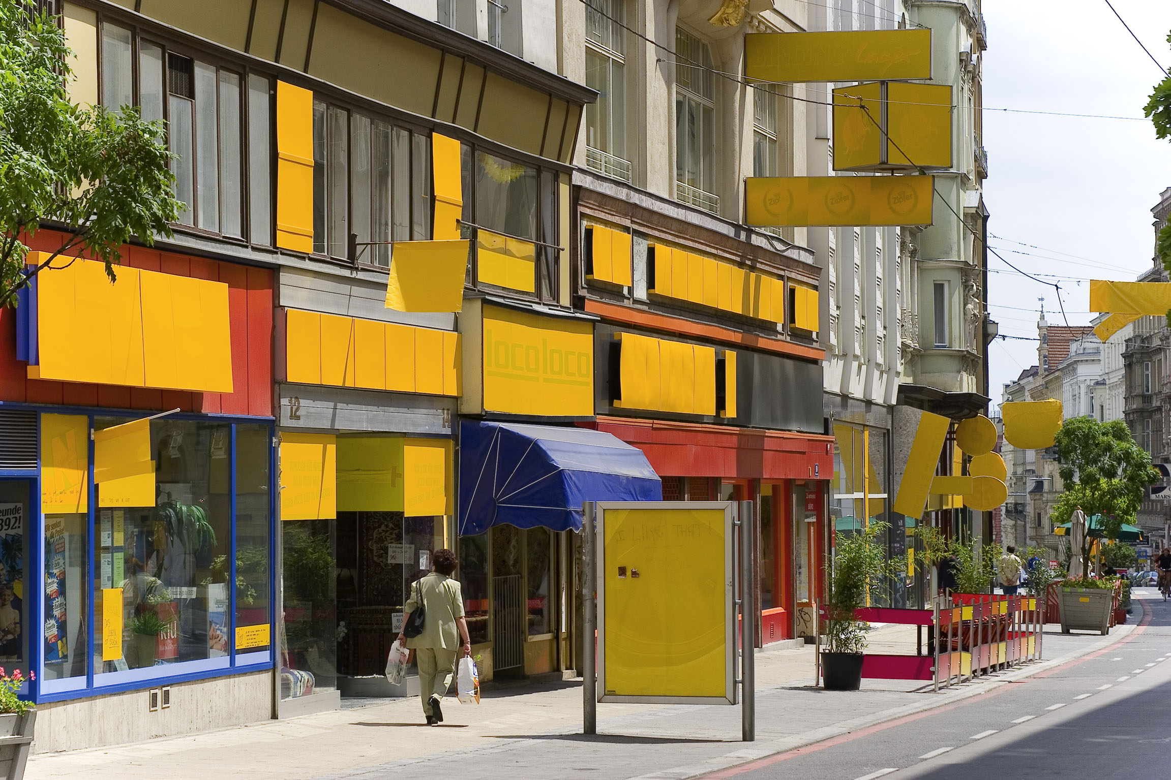 Il duo Steinbrener – Dempf di Vienna, opera sul territorio urbano, inseguendo dunque il rapporto arte/città. Di grande efficacia l’intervento “Delete” – realizzato nell’estate 2005, al settimo distretto, e qui documentato – con la sparizione, per due settimane, di tutte le insegne, pubblicità, slogans, che costituiscono il tessuto semiotico di un’arteria cittadina. Ovvero azzeramento dell’assordante, insistente comunicazione commerciale che, nell’onnipresenza e nell’iterazione, si vanifica comunque nella ricezione del cittadino. Due inaspettate settimane di silenzio, con le insegne imbavagliate dal tessuto giallo, che in ogni caso propongono una nuova lettura di quella strada. Anche l’altra coppia di artisti, i fratelli Maik e Dirk Loebbert, interviene sull’architettura e l’ambiente urbano. Le foto tratte dal progetto “Anonymus” documentano una curiosa operazione: quella di citazioni di interni, dislocati però su percorsi pubblici, come “Gardarobe”, ”Dressing Room”…realizzati con il recupero di oggetti di scarto, nel concetto dunque del riciclo. Mini-installazioni, abbandonate poi a se stesse, soggette al logorio del tempo e alla naturale decomposizione.